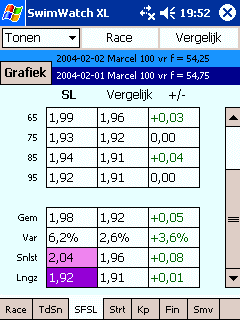 In deze mode kunnen analyses worden getoond, samen met een vergelijkende race. Dat maakt het mogelijk om verschillen te zien tussen races van dezelfde zwemmer, of verschillen tussen twee zwemmers.
