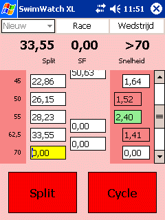 Hierbij worden dezelfde meetpunten en secties gebruikt als in de SwimWatch Race Analyzer software (voor laptop).
