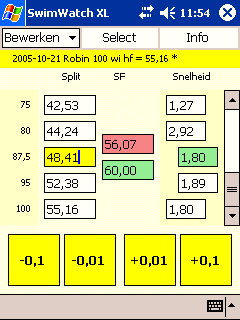 Als de opname niet helemaal goed is verlopen, kunnen de opgenomen gegevens in deze mode worden aangepast. Splittijden en slagfrequenties kunnen worden aangepast met vier knoppen of met het ingebouwde toetsenbord op het scherm. Na het aanpassen kunnen de gegevens opnieuw worden opgeslagen op de plaats van de origineel opgenomen data.